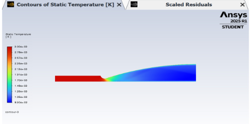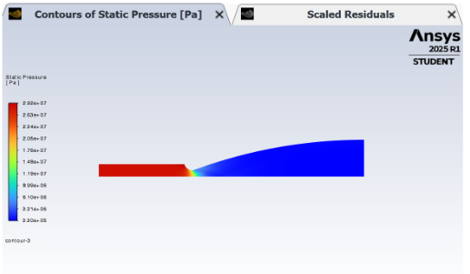 The static pressure contour shows a sudden drop near the nozzle throat, indicating a shock transition region. This pressure gradient helps identify shock location and its strength within the supersonic expansion.