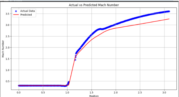The final outcome of the project is a trained Artificial Neural Network (ANN) model that accurately predicts Mach number along the length of a rocket nozzle, effectively capturing shock wave behavior based on position data. The ANN demonstrated high accuracy in replicating CFD-derived Mach profiles, with sharp gradients indicating shock locations.