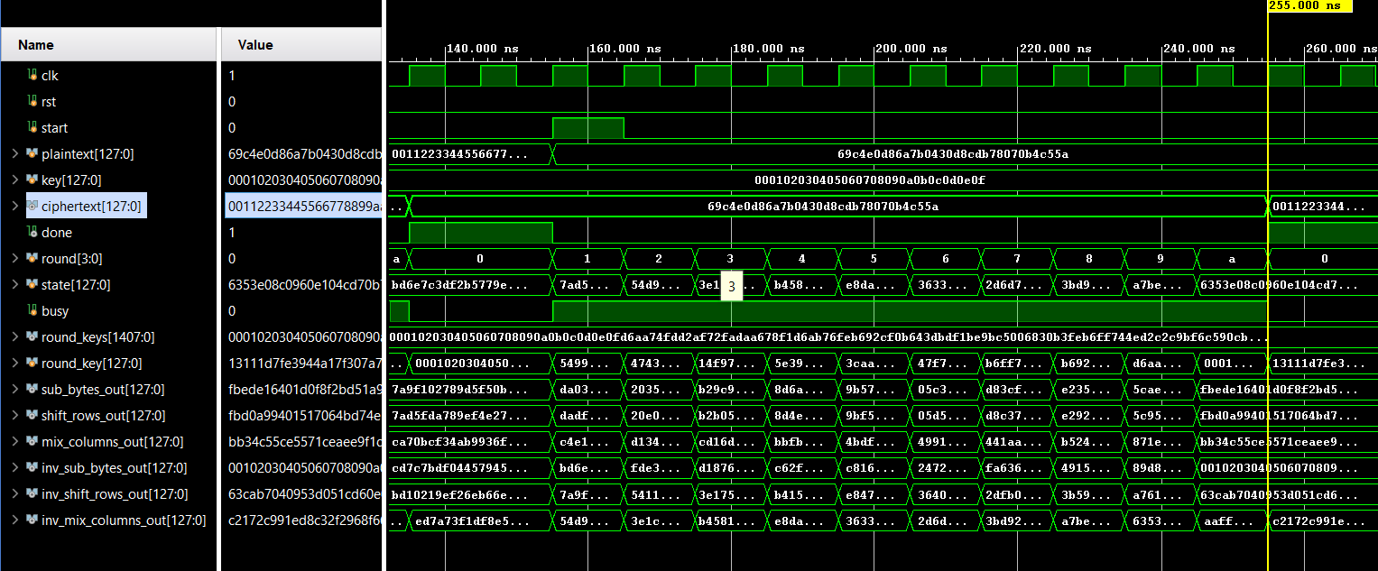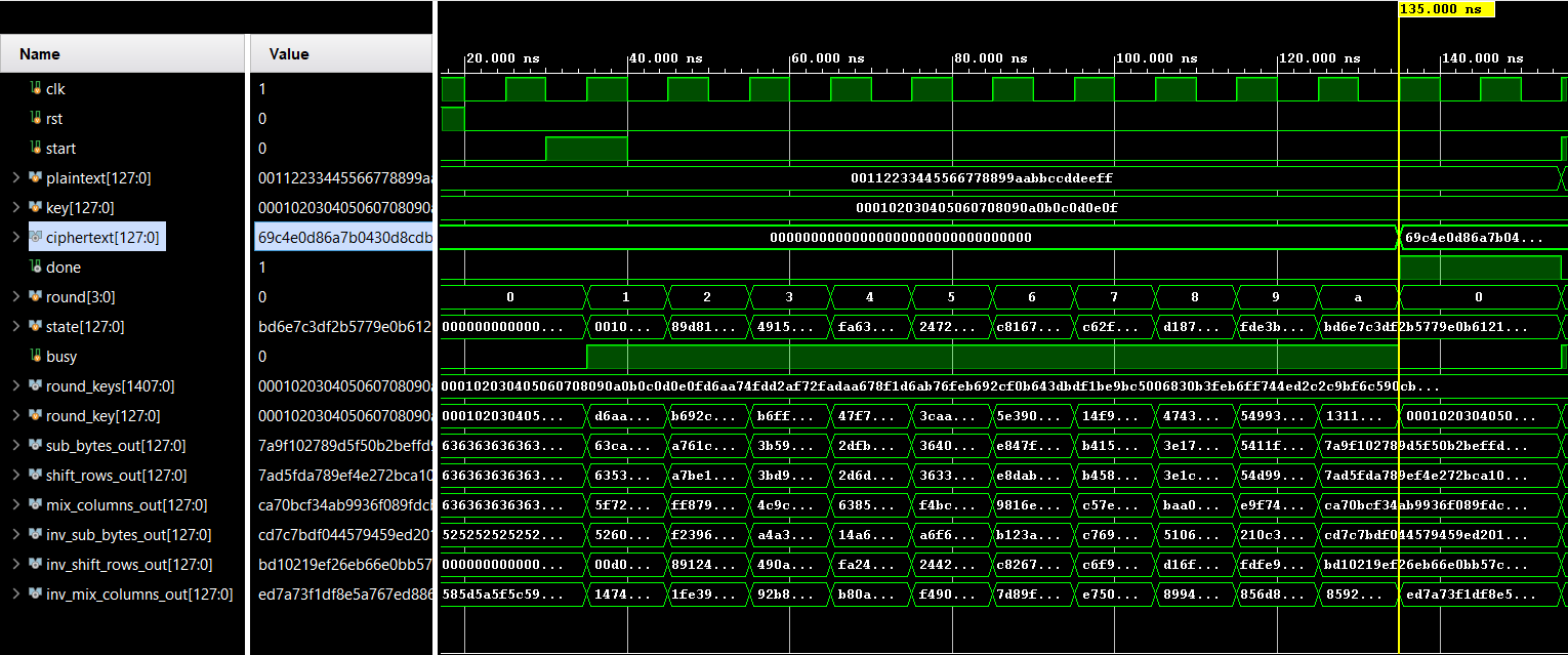 - Simulation Output: Waveforms verified correct sequential application of AES rounds and transformations.