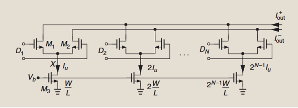 This is a figure of binary-weighted current steering DAC.Now here, the tail current is steered to the left or the right by each differential pair, causing only a small voltage excursion at node X. Now , since the total array current is relatively constant, the ground bounce is much smaller. Of course, another advantage of this configuration is that it naturally provides differential outputs.