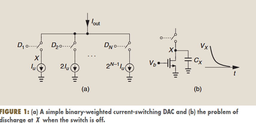 The current-switching structure shown in Figure 1(a) suffers from dynamic errors. As depicted in Figure 1(b), when a switch turns off, the top terminal voltage of its corresponding current source collapses to zero. Thus, the next time that this branch is enabled, the (nonlinear) capacitance at this terminal must charge up, drawing a significant transient current from the output node. Moreover, since switching actions change the total current carried by the array, the ground voltage experiences large fluctuations in the presence of parasitic series inductances, such as those due to bond wires. Both of these effects can be greatly suppressed through the use of current steering.