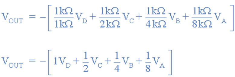 Vout = -[0+0+0+⅛*Va] = -Va/8 .Thus output voltage is -V/8, when input is 0001 in binary form.