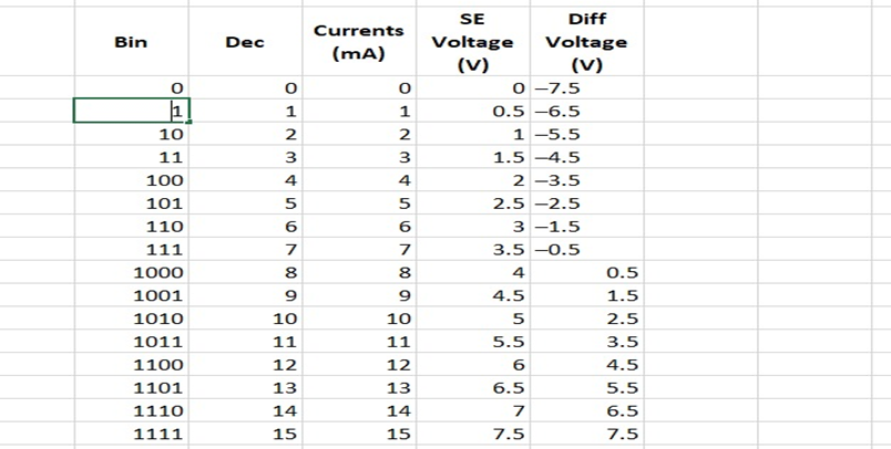 With such sorts of permutation, calculating Vout for all digital inputs from 0000 to 1111, we get the outputs as tabulated below: