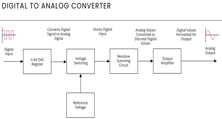 A digital to analog converter (DAC) is a circuit that transforms a digital signal, typically a sequence of 1s and 0s, into an analog signal, which can be a voltage or current. Few examples include Audio Systems; DACs play a crucial role in audio systems, converting digital audio data into analog signals. Signal generators and Data Acquisition Systems are some other applications.
