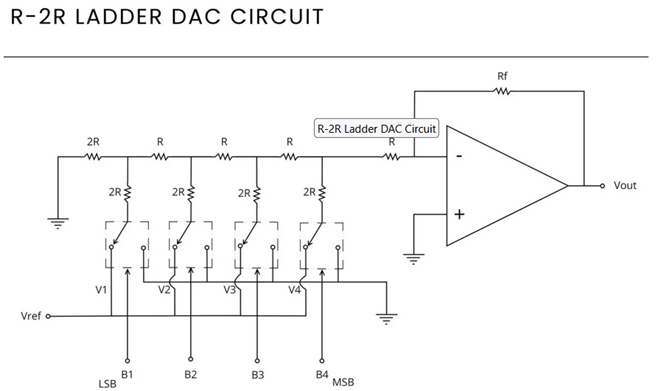 A 4-bit digital input is applied to the DAC.Each bit corresponds to a specific voltage level determined by its position in the ladder.This DAC consists of a combination of resistors with values R and 2R.Each bit of the digital input is connected to a switch. If the bit is a "1", the corresponding switch connects the point in the ladder to Vref. If the bit is a "0", the switch connects it to ground.The ladder network acts as a voltage divider. The output voltage is the weighted sum of the voltages at each point in the ladder.
