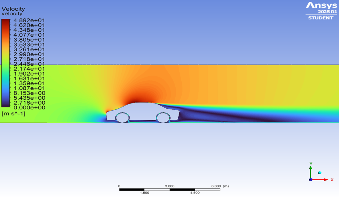 Velocity contours show the flow speed distribution around the vehicle and are vital in locating high-velocity and low-velocity regions. High-velocity regions usually occur over the streamlined roof and sides, whereas low-velocity regions tend to be situated at the back of the vehicle, where flow separation and wake formation take place. These make a considerable contribution to drag.