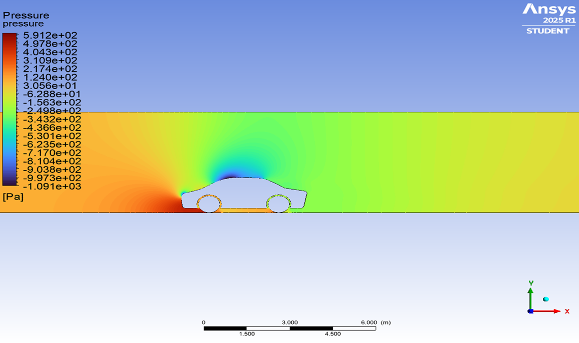 Pressure contours, however, show the static pressure distribution on the surface of the vehicle. They are essential in determining pressure drag, as a high-pressure area normally develops at the front (stagnation point) and a low-pressure area at the back. This pressure difference generates an overall force that acts in opposition to the motion of the car. Velocity and pressure contours combined supply essential knowledge of aerodynamic performance, allowing designers to optimize the shape for less drag and increased efficiency.