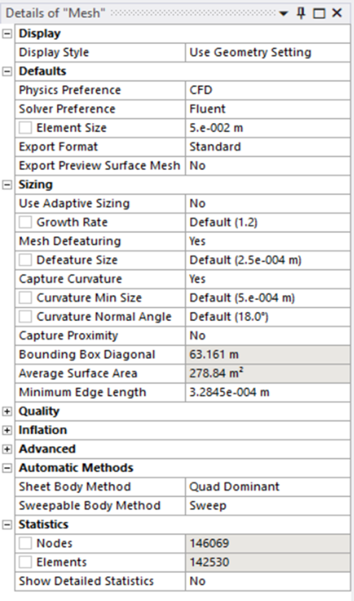 To increase accuracy further, inflation layers were added close to solid surfaces to solve the boundary layer—a critical consideration in accurately calculating the drag coefficient. Mesh quality was assessed in terms of parameters such as skewness and aspect ratio to guarantee numerical stability and convergence..