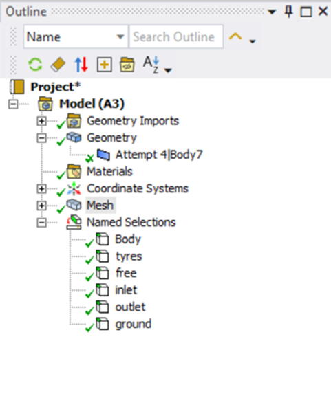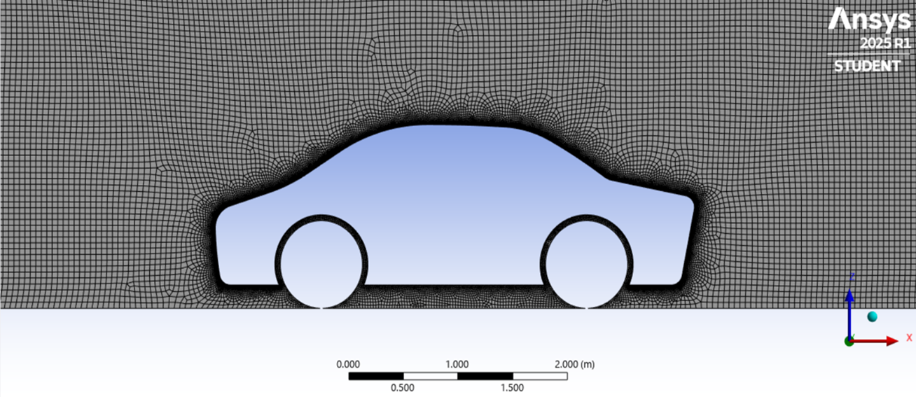 Meshing is a significant process in simulation in ANSYS, whereby the computational domain is broken down into small finite elements in which fluid flow equations can be solved numerically. A detailed mesh of the 2D cross-section of the car was created in this project in order to capture the geometry and the flow around the body of the car accurately.