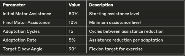 The gradual reduction in motor assistance from 80% to 10% over rehabilitation cycles demonstrates the system's ability to challenge patients progressively. The 15-cycle adaptation interval provides sufficient time for patient adaptation without causing fatigue.