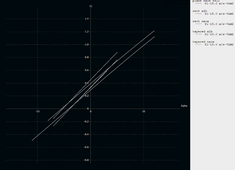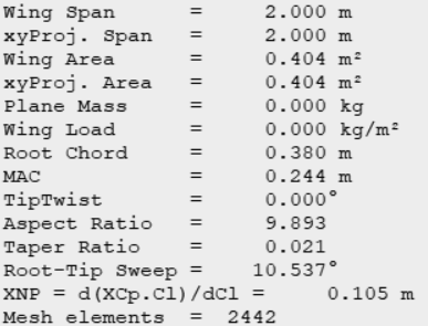 Next, an Albatross-shaped wing was modelled on XFLR5, using about 108 sections and 2442 mesh elements to ensure accurate results. This model was then simulated on XFLR5, using the Ring Vortex (VLM2) analysis method with viscous flow at a headwind velocity of 15 m/s. All the other parameters were considered according to sea level conditions. The analysis was carried out between -2° to +2.5°, while keeping an increment of 0.5°. Beyond 2.5 degrees, the VLM2 Analysis method provides inaccurate results.